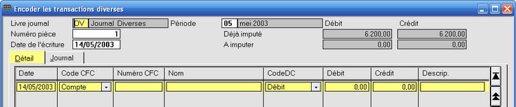 Déjà imputé et À imputer: ces champs affichent les montants comptabilisés et à comptabiliser. L'opération ne peut être sauvegardée que lorsque le solde débiteur et créditeur sont égaux ou lorsque le montant débit et crédit à comptabiliser se trouvent sur zéro.