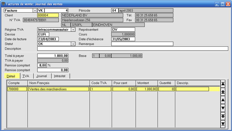 Si un compte de vente avec un autre code de TVA que "1" est lié au client, le code de TVA sur la ligne de comptabilisation n'est pas automatiquement mis sur "1". Vous devez changez le code de TVA en "1" de façon manuelle.
