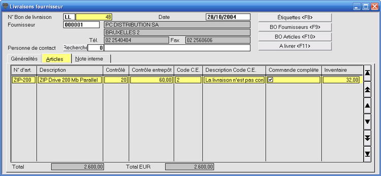 Cliquez sur le bouton BO Fournisseurs <F9> et remplissez les articles livrés. Retournez vers l'écran Livraisons fournisseurs.