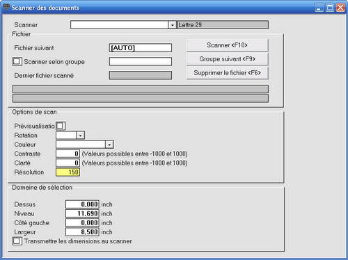Une résolution de 150 DPI suffit normalement pour les documents standards. Si vous scannez essentiellement des dessins, mettez la résolution à 300 DPI. Ceci augmentera évidemment également la grandeur du fichier.