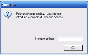 Introduisez le numéro du chèque-cadeau et appuyez sur ENTER. Le montant du chèque est chargé et rempli dans le champ Prix par déf.