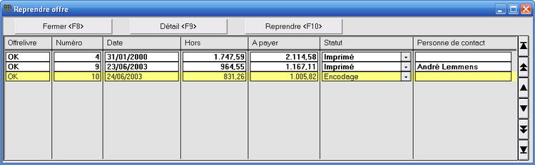 Cliquez sur le bouton Reprendre offre <F8>. L'écran Offre commandes est ouvert et affiche toutes les offres de ce client avec le statut "Encodage", "Imprimé" ou "Par défaut". Les offres avec le statut "Facturé" ne sont pas reprises.