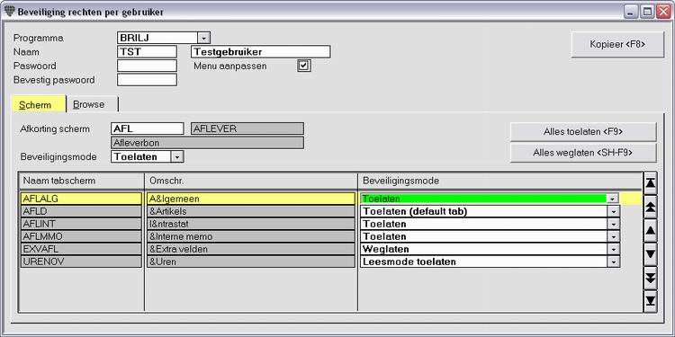 Klik in het vorige scherm op Uitgebreid beheer <F10> om het scherm Beveiliging rechten per gebruiker te openen.