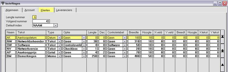 Extra velden op de klanten: zie menu Instellingen, Account, tabblad Klanten.